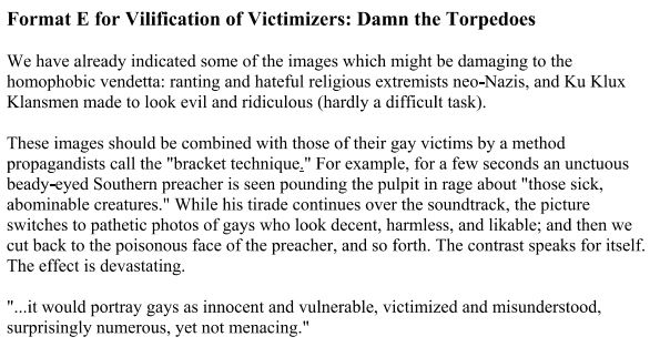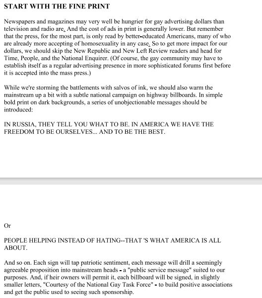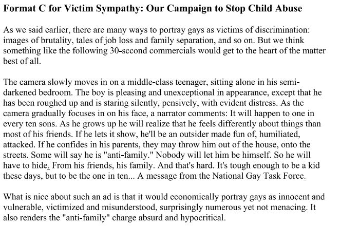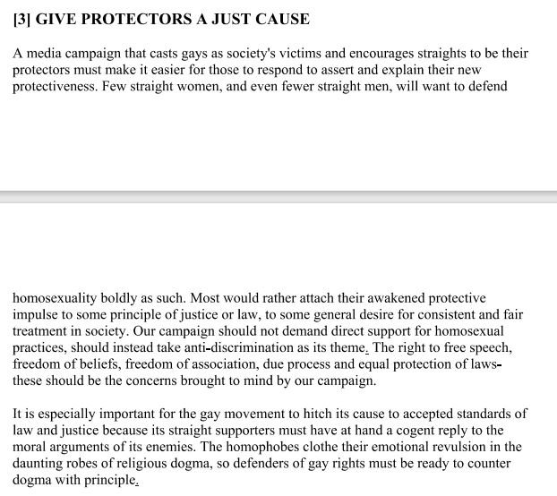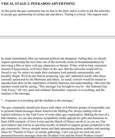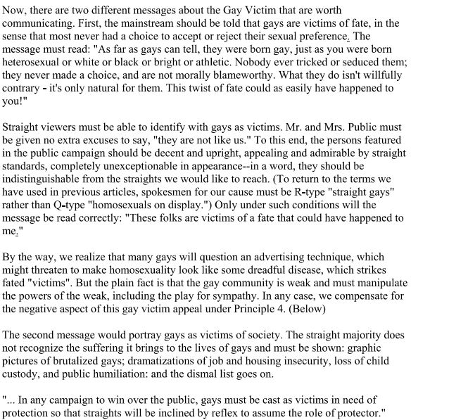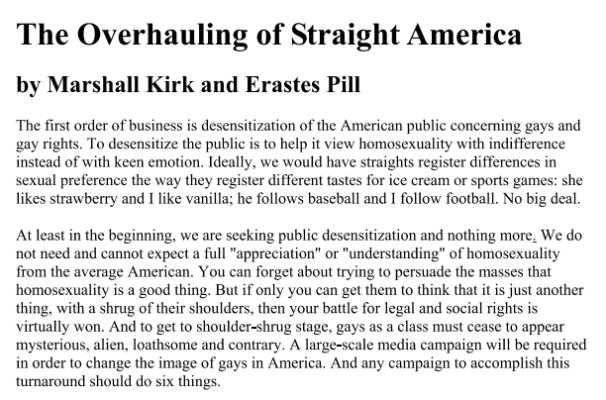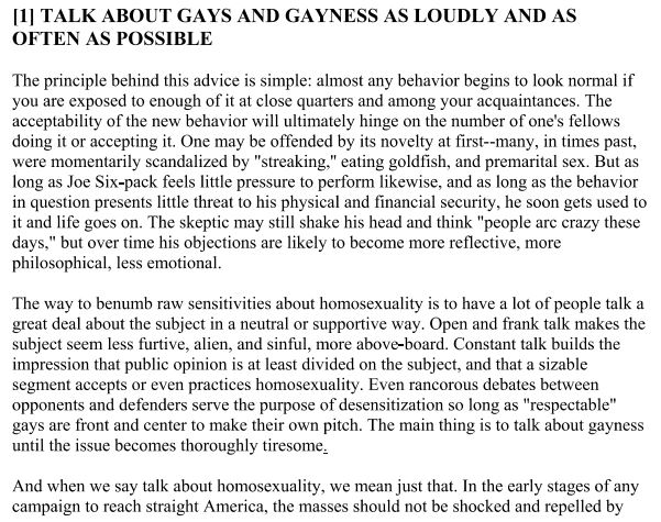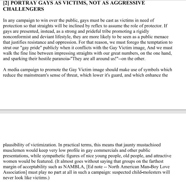Before you say there is no gay or trans agenda, this is not 2000 or even 2010. It’s 2023 and we all know there’s an agenda because it is very out in the open. But before it was so out there that we couldn’t do anything to avoid it, it was out there in a hidden-in-plain-sight kind of way. Then in the 1980’s, in the form of a marketing campaign called The Overhauling of Straight America, which was a bullet-pointed strategy to desensitize Americans to homosexuality via any means necessary. And boy, did it work. I will add screenshots of the entire campaign at the end of this post but we’re probably not going to talk about it here unless I have to refer to it to make a point. Right now my point is just that there is an agenda. After that, I’ll add screenshots of The Homosexal Manifesto, also written around the same time as The Overhauling of Straight America, but much more graphic and disturbing. Again, I’m only adding as documentation of evidence of an agenda. Warning: Children who can read should not be within viewing distance of these screenshots.