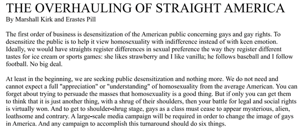 The Overhauling of Straight America from 1987 was a bullet-pointed literal campaign complete by Marshall Kirk and Erastes Pill. Bullet-points showed how America would be desensitized to homosexuality through a number of strategies: Repetitiveness; portraying gays as victims and vilifying their (imagined) oppressors; fundraising; celebrity “endorsements” (as though homosexuality is a product to be sold – newsflash, that’s exactly what it is!); subliminal messaging on billboards and other high-profile locations; taking over entertainment; running gay men for political office; and testimonials – these are just a few of the strategies they’ve employed.