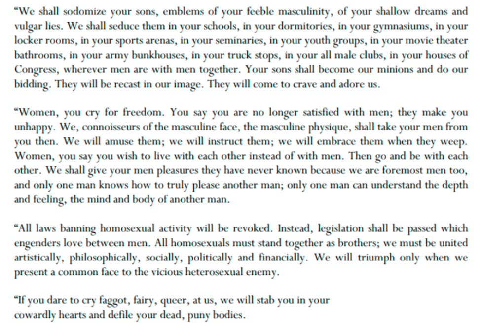 Revolutionary, and The Homosexual Manifesto all make