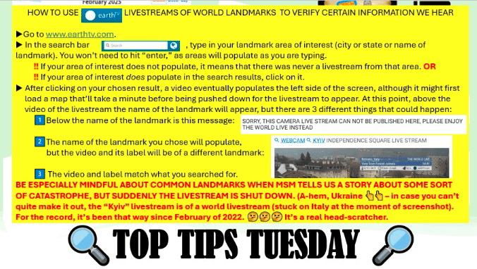 Found this on Watch Maga‘s YT series, “Dank Memes.” Follow them for valuable and entertaining information packed into a very fun format -I often find myself dancing as I’m watching!If you ever suspect something isn’t quite as it seems, you might be able to confirm your suspicions on EarthTV.com. The most interesting one I found yet was the unavailable livestream for Kyiv after seeing a video from Illusion Warfare aroused my suspicions that we were being lied to about the war.